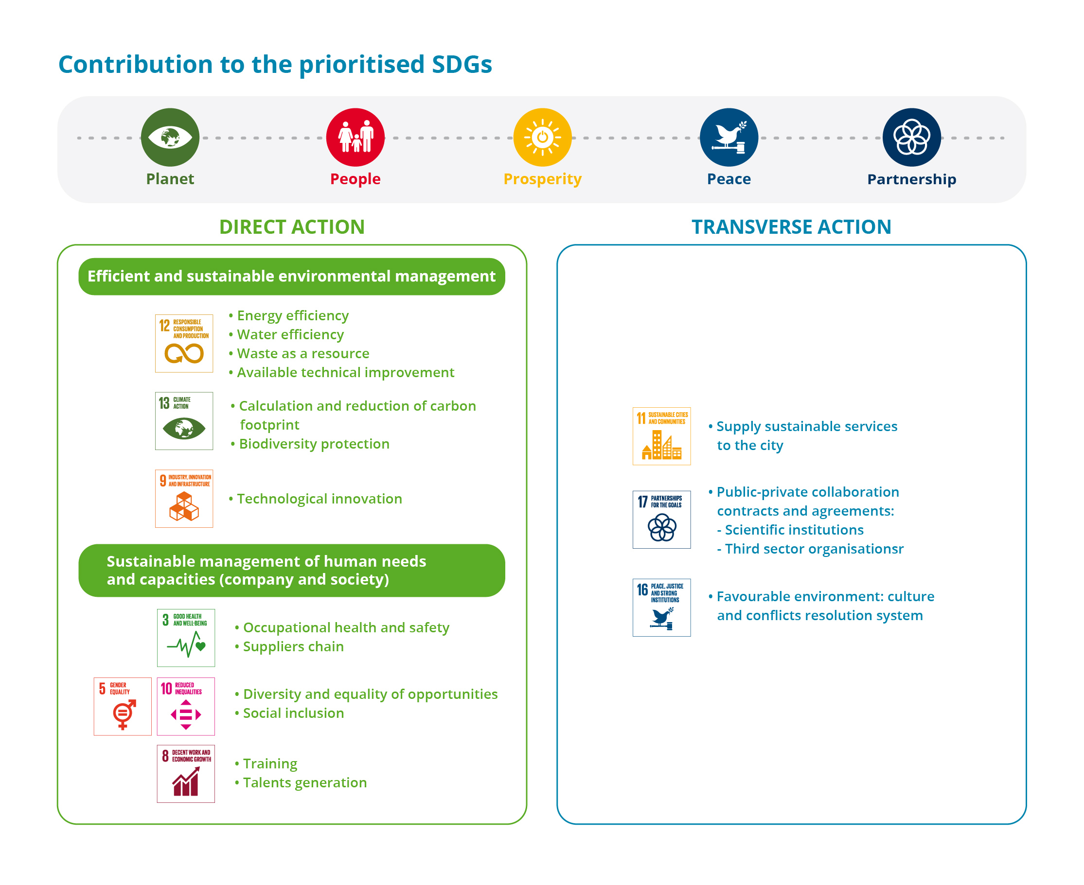 - Human development (generation of talents; diversity and equal opportunities, occupational safety and health, social inclusion).
