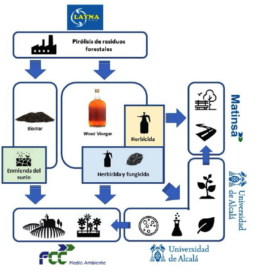 The project aims to develop new experiences in the field of pyrolysis of lignocellulosic waste to generate three cutting-edge bioproducts: biochar, biobitumen and wood vinegar for road infrastructure maintenance (wood vinegar as a herbicide and biobitumen in pavement repairs) and in the maintenance of green areas (wood vinegar and biochar as an organic amendment).