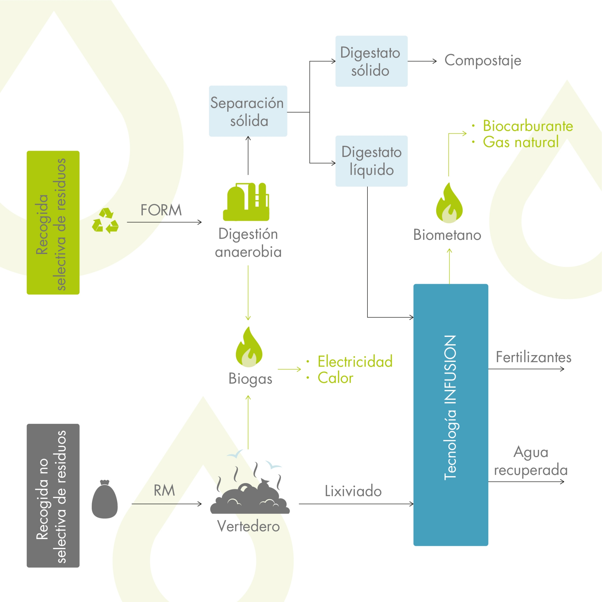 INFUSION vise à démontrer et à valider à l'échelle pilote un traitement de purification de l'eau pour le lixiviat de décharge et le digestat liquide de FODM basé sur l'économie circulaire, afin d'obtenir des ressources (biogaz, biofertilisants et eau recyclée). Ce système sera basé sur un traitement qui combine plusieurs technologies de traitement biologique et de filtration et sera validé à l'échelle pilote dans deux centres de gestion des déchets : Ecoparc 2, à Montcada i Reixac (Barcelone), et COGERSA, à Gijón (Asturies).